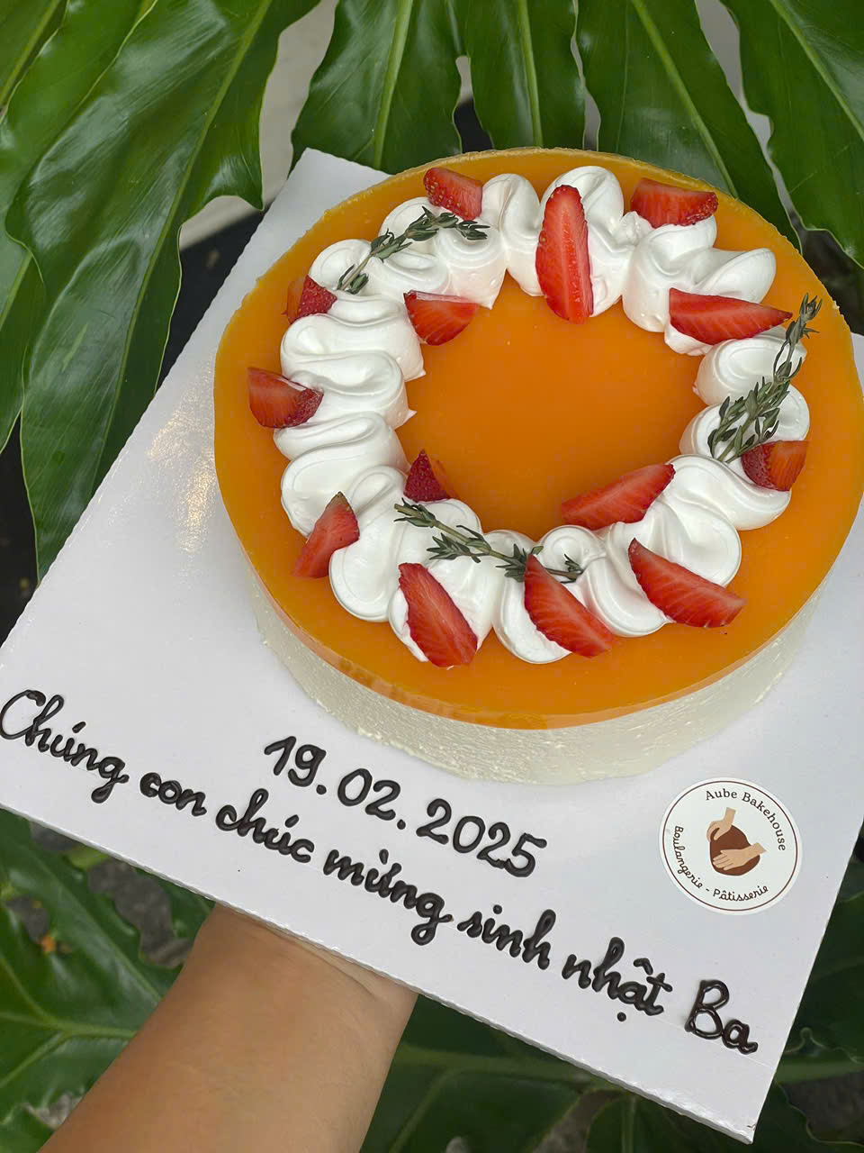 Bánh mousse chanh dây nguyên ổ của Aube là lựa chọn nhẹ nhàng và thanh mát cho những dịp sinh nhật. Lớp mousse mịn mượt, vị chua ngọt hài hòa từ chanh dây tươi, xen kẽ lớp cốt bánh mềm nhẹ, tạo nên tổng thể cân bằng và tinh tế. Hương vị nhiệt đới đặc trưng giúp chiếc bánh vừa sang trọng vừa dễ ăn, phù hợp cho cả trẻ nhỏ lẫn người lớn.