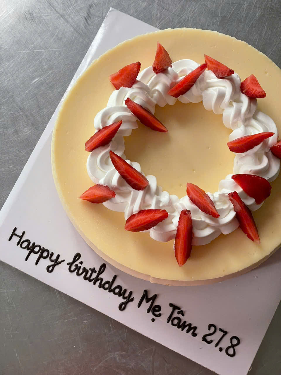 Bánh New York Cheesecake nguyên ổ của Aube có kết cấu đặc hơn và vị phô mai rõ nét hơn so với Burnt Cheesecake. Nếu Burnt Cheesecake có lớp mặt cháy caramel nhẹ và phần ruột mềm tan, thì New York Cheesecake lại mịn đặc, béo ngậy nhưng vẫn giữ được độ ẩm vừa phải. Bánh được trang trí bằng trái cây tươi để cân bằng vị béo, tạo cảm giác dễ chịu khi thưởng thức. Với vẻ ngoài tối giản nhưng tinh tế, đây là lựa chọn hoàn hảo cho những buổi sinh nhật yêu thích phong cách cổ điển.